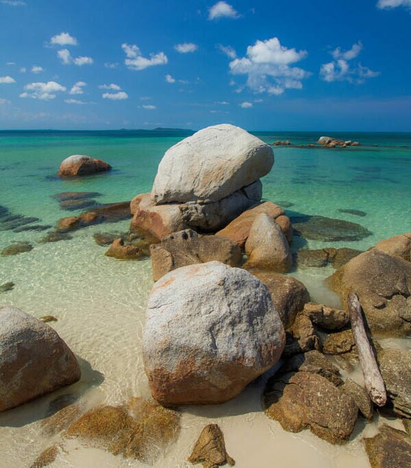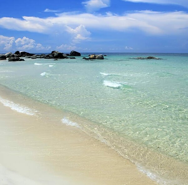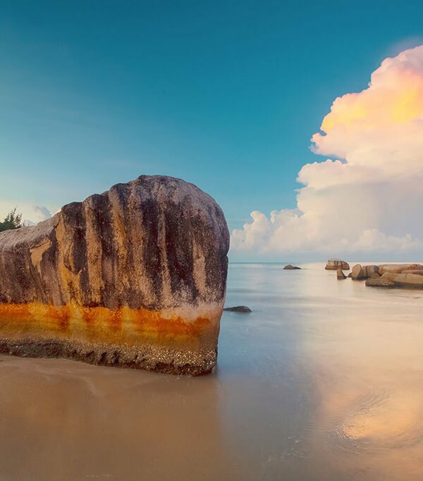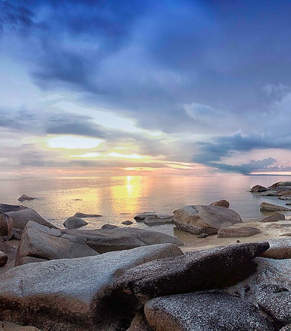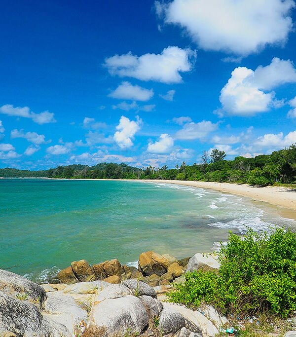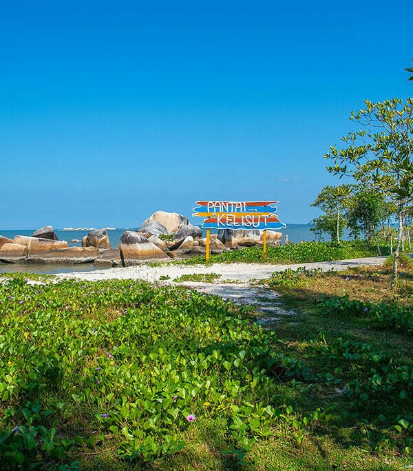 Pantai primadona wisatawan lokal dengan air kebiruan yang jernih berbalut butiran pasir putih lembut dan barisan batuan granit di garis pantainya.